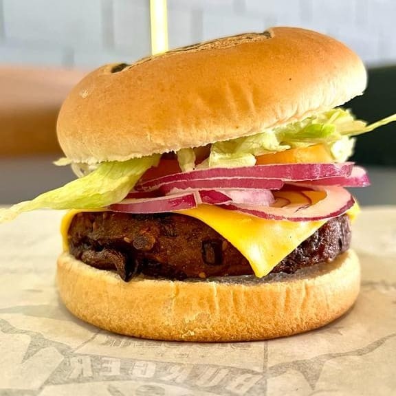 Descubra a combinação perfeita de sabor e leveza no nosso hambúrguer de cogumelo, uma opção irresistível. Este combo inclui **2 hambúrgueres de cogumelo**, **queijo prato**, **alface americana**, **tomate**, **cebola roxa** e **maionese temperada**. Favorita a loja para receber ofertas exclusivas! (Foto ilustrativa está com um hambúrguer).