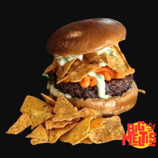 Pão, 1 hambúrguer angus 160g, queijo, maionese artesanal, cheddar e Doritos.
