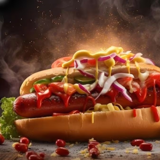 1 vina, tomate, farofa, milho, batata palha, catchup, calabresa e maionese.