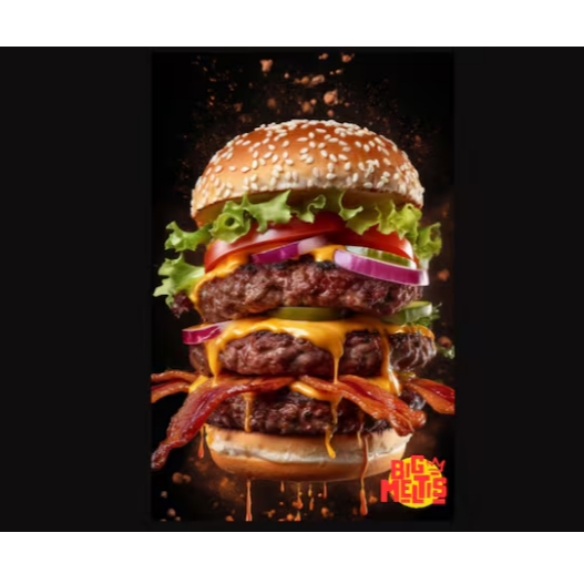 Pão, 3 hambúrgueres angus 160g, 3 camadas de bacon fatiados, 3 camadas de queijo, maione artesanal, tomate, alface, picles, cebola roxa.