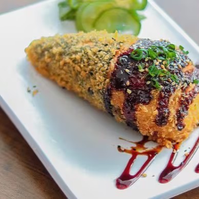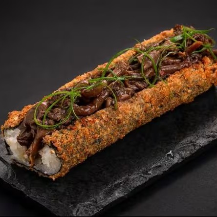 Arroz e morango enrolado em uma alga, empanado e frito, finalizado com chocolate preto