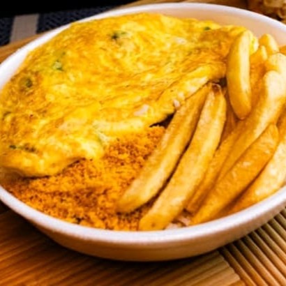 Omelete temperada e bem macia, acompanhado de arroz, feijão bem temperado, macarrão e batatinhas fritas!