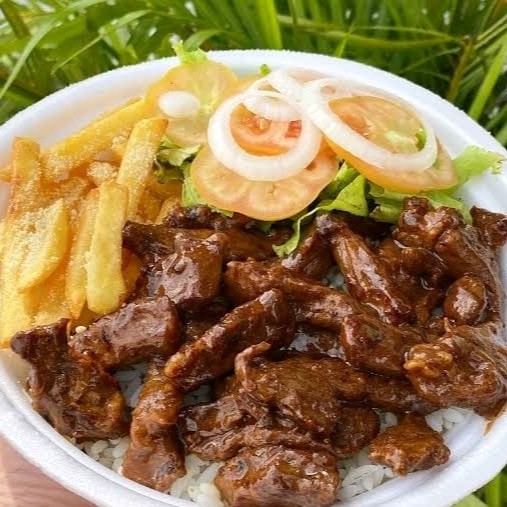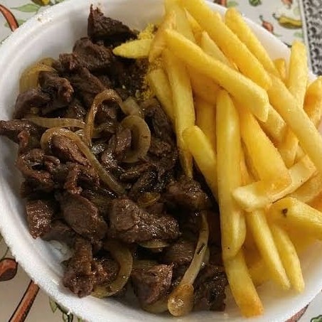 Marmita de alcatra, alcatra em tiras com arroz, feijão, farofa, macarrão e batata frita