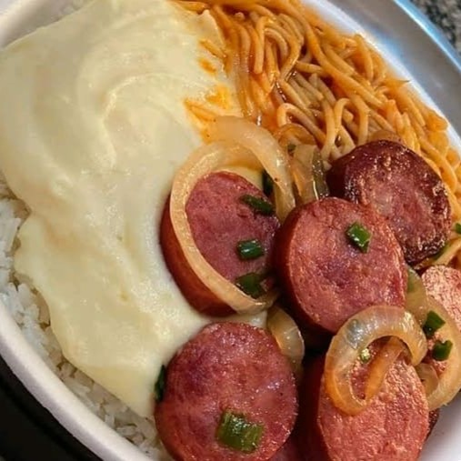 Marmita de calabresa acebolada: deliciosa calabresa dourada na chapa, servida com cebolas bem refogadas, soltando aquele aroma irresistível. Acompanha arroz soltinho, feijão caseiro, macarrão e batatinhas, garantindo uma refeição completa e saborosa.