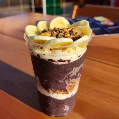 Açaí cremoso com leite condensado, leite em pó e bananas fatiadas