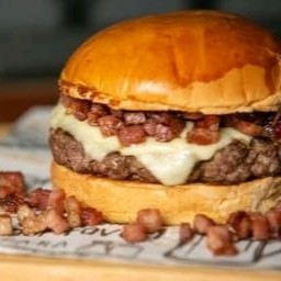 Um hambúrguer irresistível, pão com carne suculenta, bacon em cubos crocante, queijo, cebola, batata palha e um toque especial de molho. Perfeito para os amantes de bacon