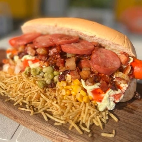 Pão macio recheado com vina saborosa, calabresa suculenta, bacon em cubos crocante, tomate fresquinho, cebola bem picada, milho e batata palha crocante. Uma explosão de sabores incríveis!