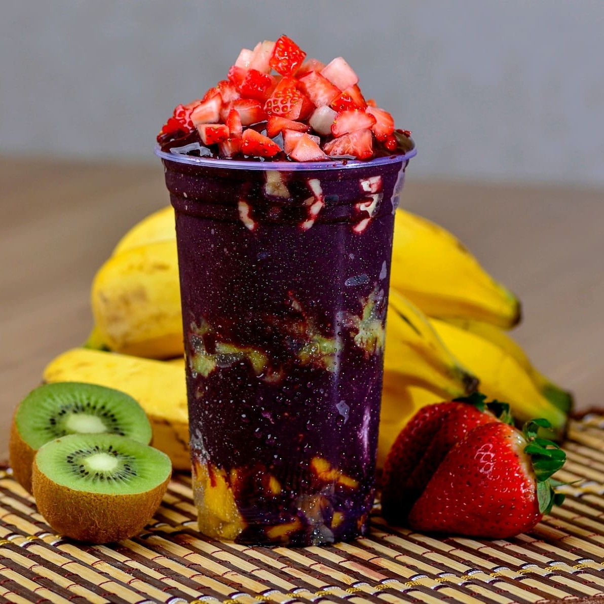 Açaí cremoso com leite em pó, leite condensado e morangos picados