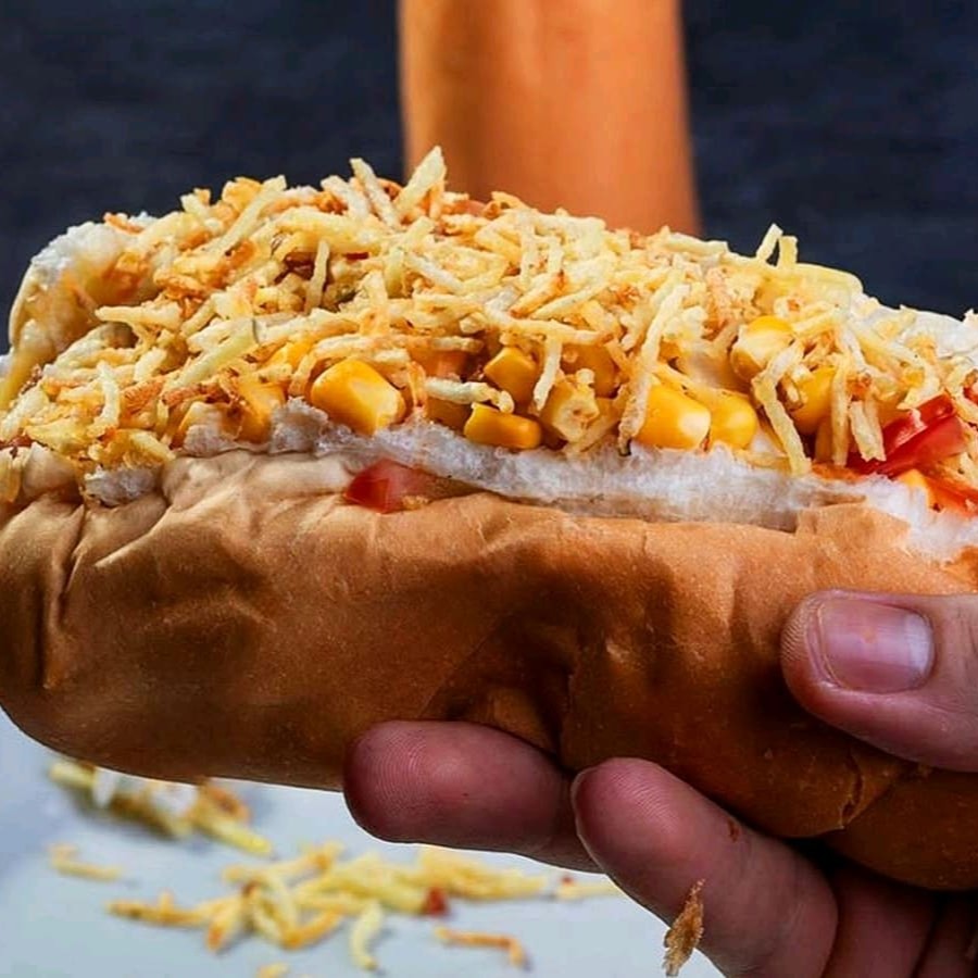 Pão macio recheado com vina saborosa, bacon em cubos crocante, tomate fresquinho, cebola bem picada, milho e batata palha crocante.