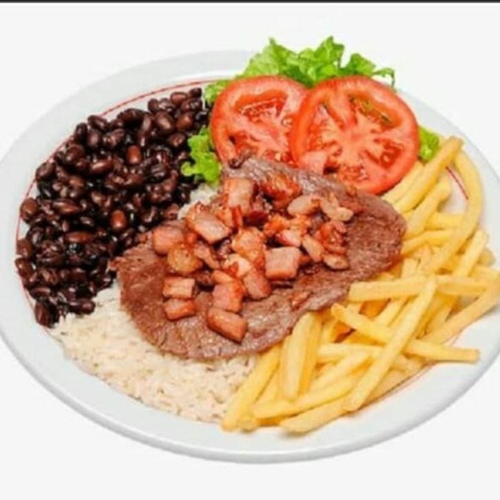 Bife de alcatra, bacon, arroz, feijão, fritas e salada.