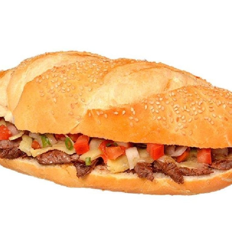 Mini baguete, alcatra, queijo, maionese e vinagrete.