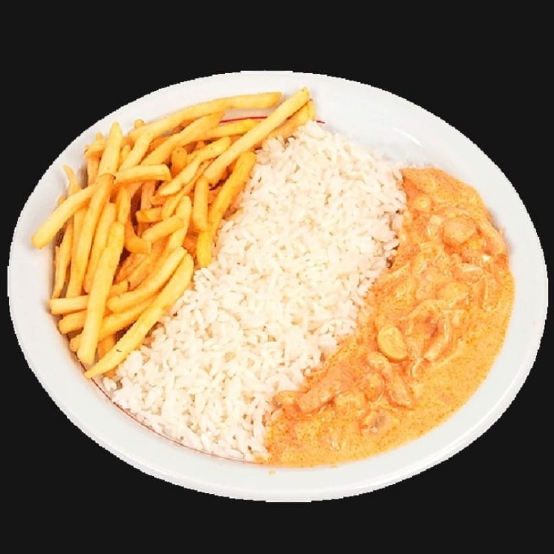 Strogonoff de frango, arroz, fritas ou batata palha ou purê