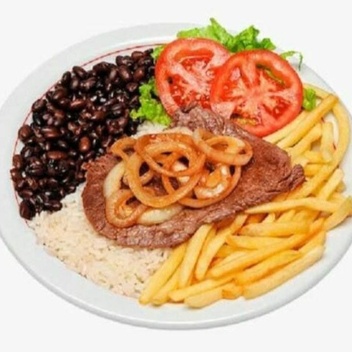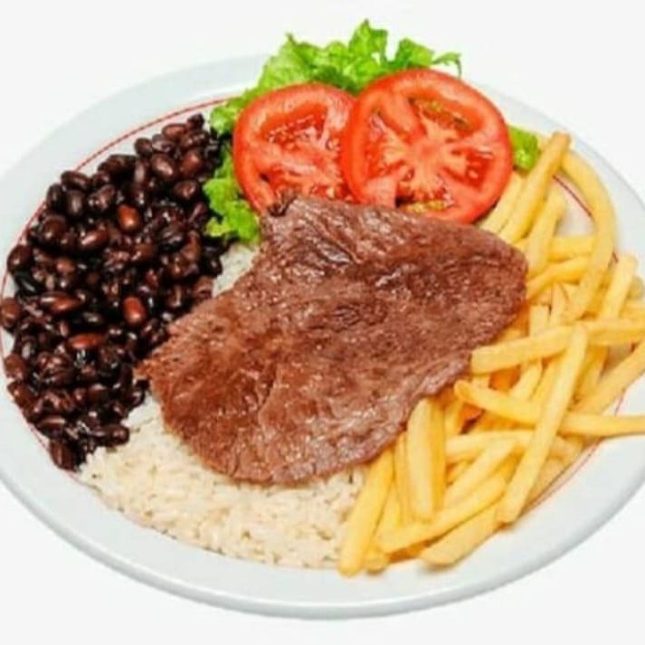 Bife de alcatra, arroz, feijão, fritas e salada.