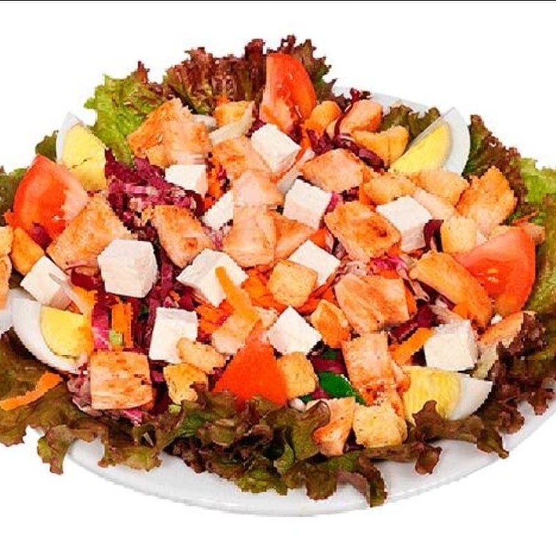 Alface crespa, alface roxa, rúcula, tomate, cenoura ralada, queijo branco, ovo cozido, croutons, filé de frango.