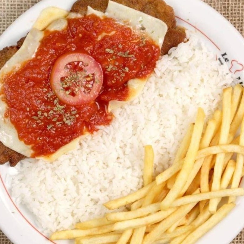 Bife parmegiana de alcatra, arroz, feijão, fritas e salada.