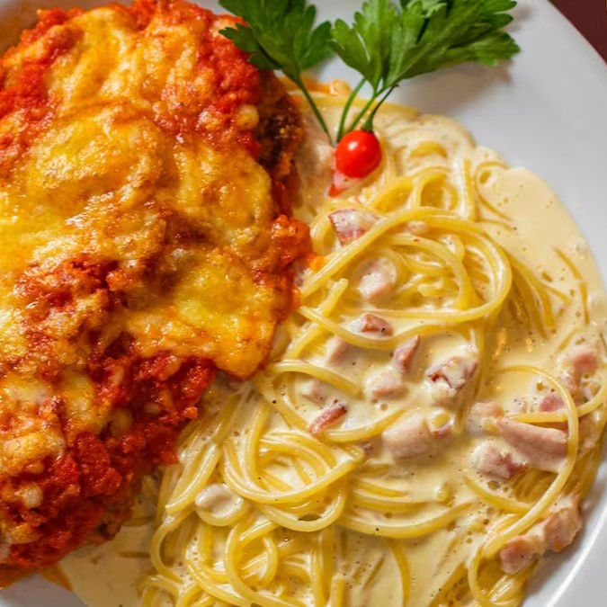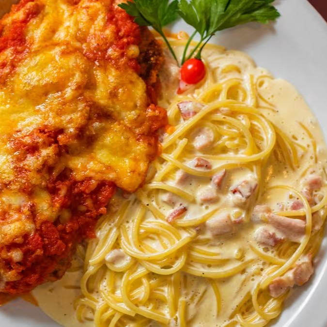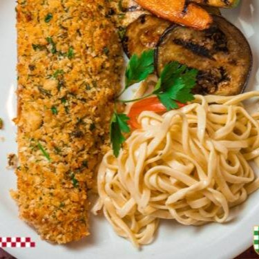 Peito de frango empanado, recheado de queijo e presunto, coberto por molho de tomate e queijo gratinado.