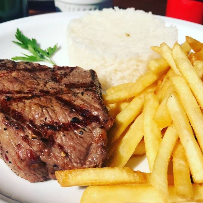 200 g de Alcatra grelhada, acompanha arroz branco, feijao, batatas fritas e farofa
