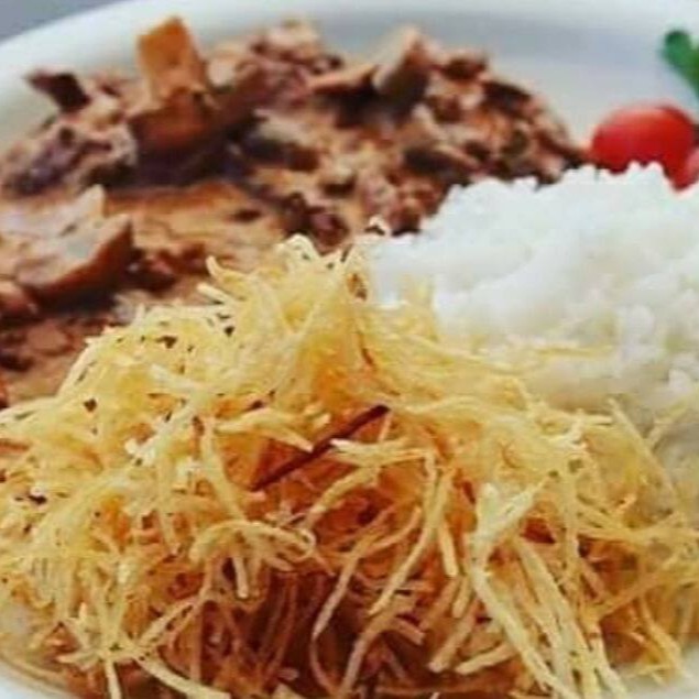 Cubos de frango com delicioso molho strogonoff, arroz branco e batata palha da casa, fresquinha e crocante.
