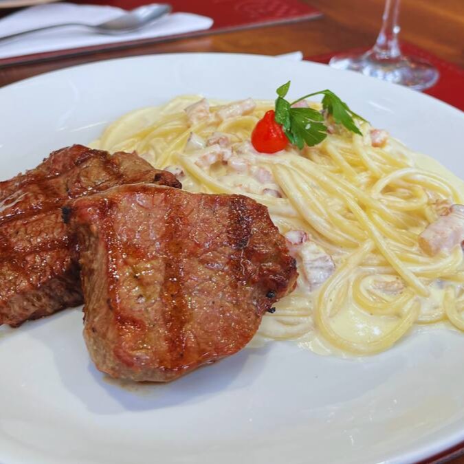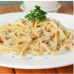 Massa com molho a base de creme de leite, gema de ovos, bacon e parmesão. Acompanhada queijo ralado.