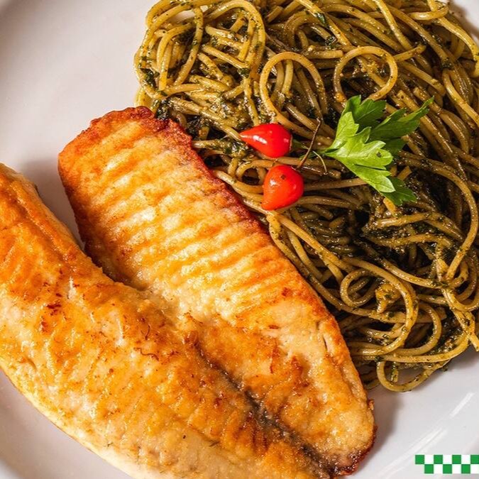 Filé de Tilápia passado no trigo e dourado na frigideira. Escolha molho para o peixe e dois acompanhamentos.