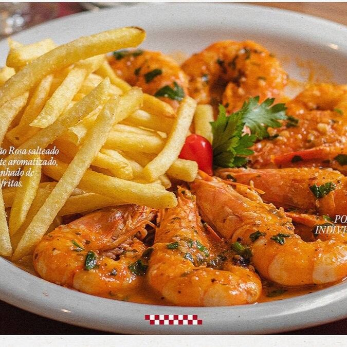 220 gr de camarões rosa, sem casca, salteados no azeite com fritas.