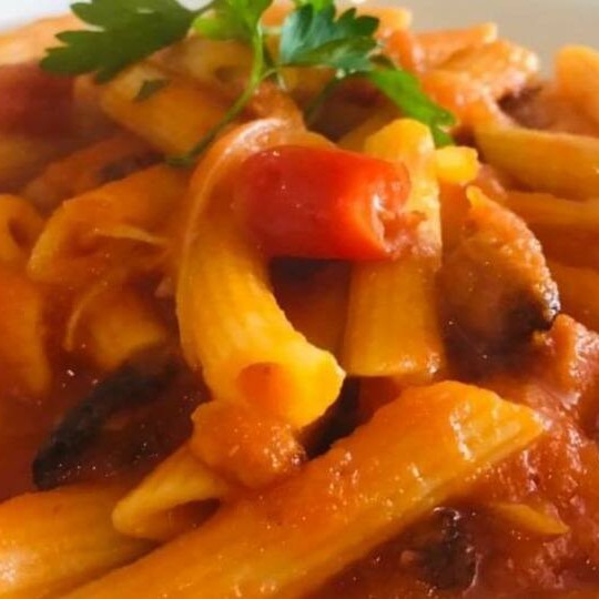 Massa com molho de tomate artesanal, berinjela e azeitonas pretas. Acompanha queijo ralado.