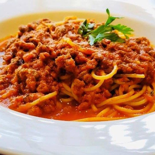 Massa com carne moída e cozida no molho de tomate artesanal da casa. Acompanha queijo ralado.