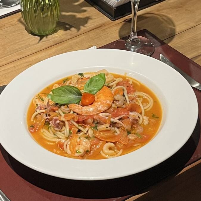 Spaghetti de grano duro com camarões rosa, mexilhões, lula e polvo ao molho da casa.