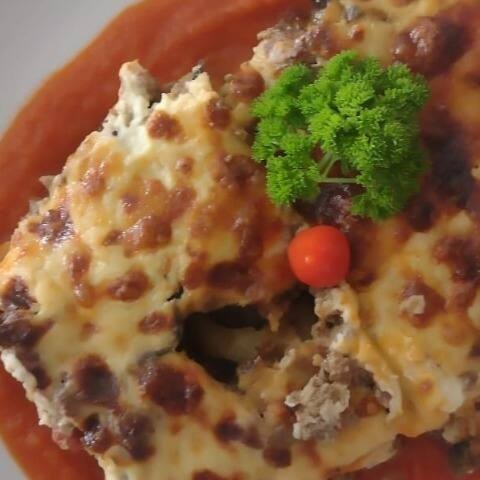 Massa Artesanal Com Ragu De Carne, Molho Ao Sugo Da Casa, Queijo Muzzarela, Parmesão E Molho Bechamel.