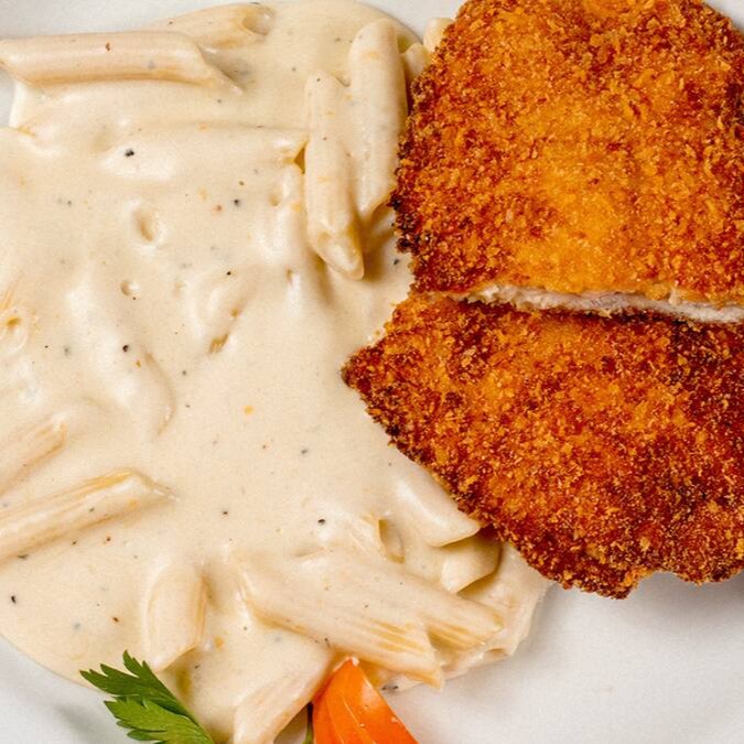 Peito de frango recheado com queijo e presunto, empanado e frito. Acompanha penne ao molho de queijos e geléia de pimenta.