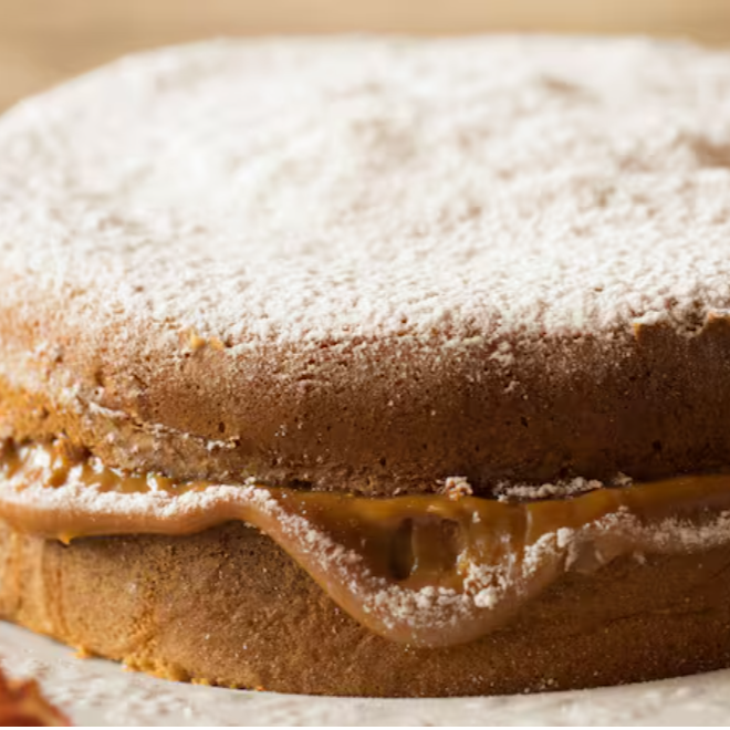 Delicioso pão de ló macio, doce de leite bem saboroso e açúcar polvilhadinho.