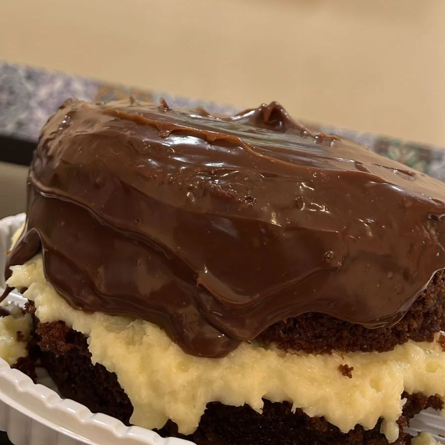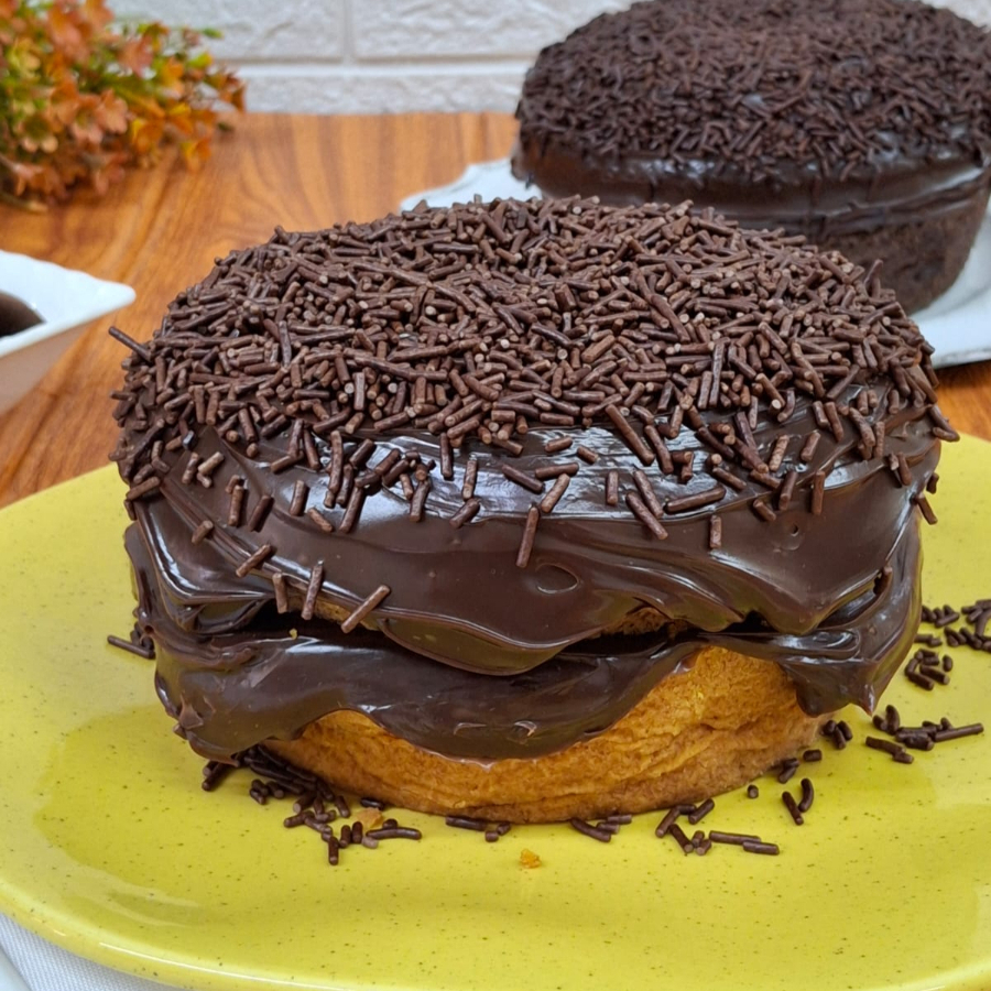 Bolo de chocolate recheado com doce de coco caseiro, coberto com brigadeiro 50% cacau. Tamanho médio, aproximadamente 850 gramas. Rende em média 8 fatias.