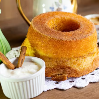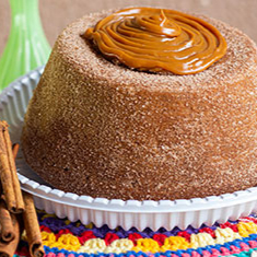 Bolo sabor churros envolto em açúcar e canela, o furo é recheado com delicioso doce de leite. Tamanho médio, aproximadamente 750 gramas. Serve 8 fatias em média.