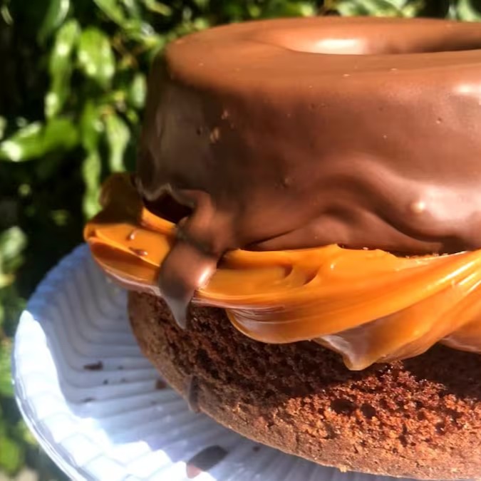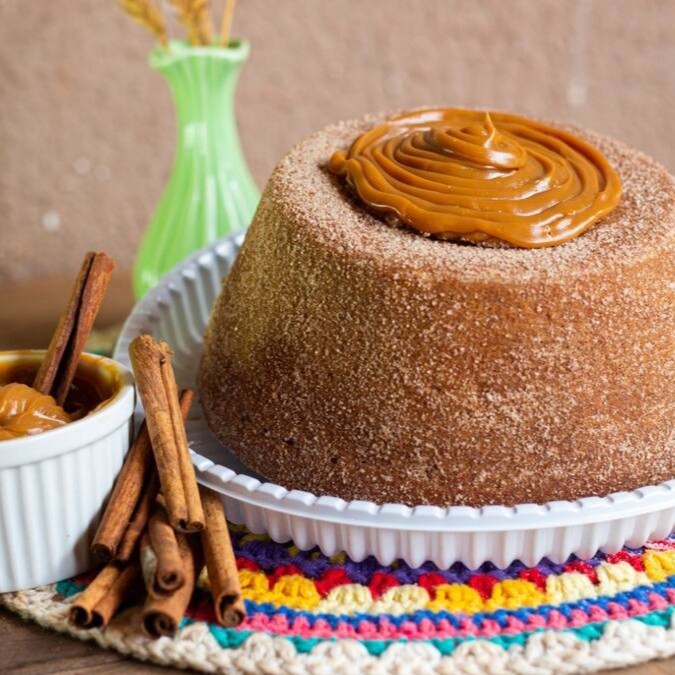 O furo do bolo todo recheado com doce de leite. Tamanho médio. Aproximadamente 750 gramas. Serve em média 8 fatias.