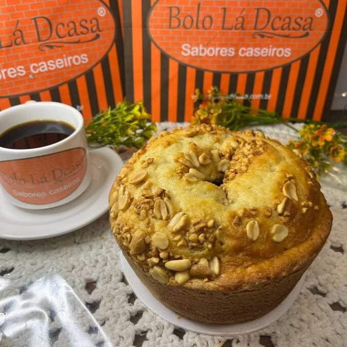 Bolo de amendoim. Tamanho médio. Aproximadamente 500 gramas. Serve em média 8 fatias.
