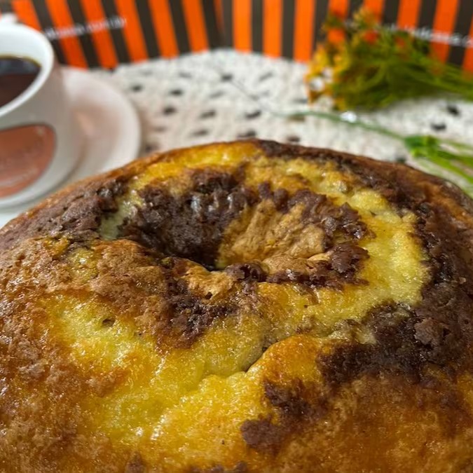Bolo Marmorizado, massa de coco e chocolate. Tamanho médio. Aproximadamente 500 gramas. Serve em média 8 fatias.