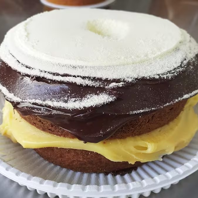Bolo de chocolate, recheado com doce de coco caseiro e coberto com brigadeiro 50% cacau. Aproximadamente 850 gramas, serve em média 8 fatias.