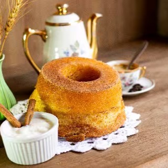 Bolo de Iogurte Natural. Com uma crostinha perfeita de açúcar com canela. Tamanho médio. Aproximadamente 500 gramas. Serve em média 8 fatias.