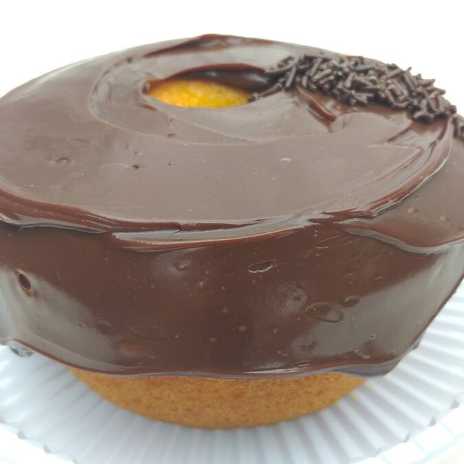 Bolo de laranja, coberto com ganache de chocolate. Tamanho médio. Aproximadamente 700 gramas. Serve em média 8 fatias.