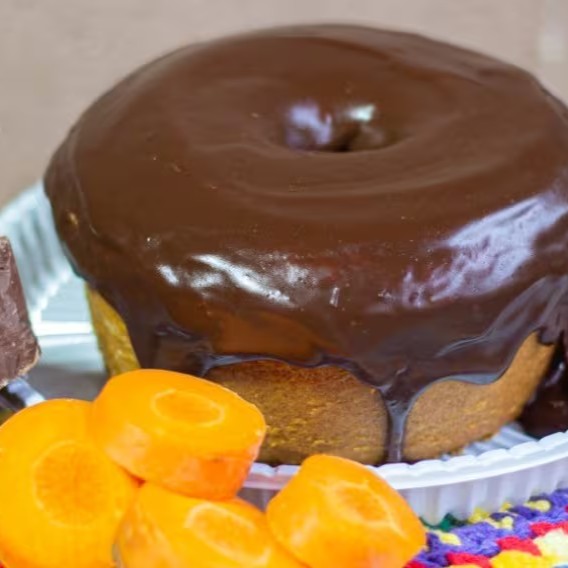 Bolo de cenoura com cobertura de ganache. Tamanho médio. Aproximadamente 700 gramas. Serve em média 8 fatias.