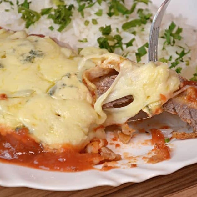 Um suculento Bife a Parmegiana que acompanha uma porção de Arroz e Mix de salada de cortesia.