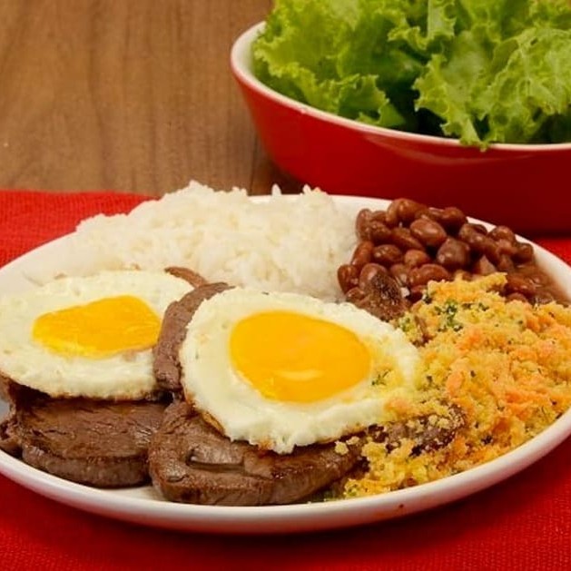 Arroz, Feijão, Massa, Farofa e acompanhamento do Dia. Ovos Fritos. Acompanha salada separada de cortesia.