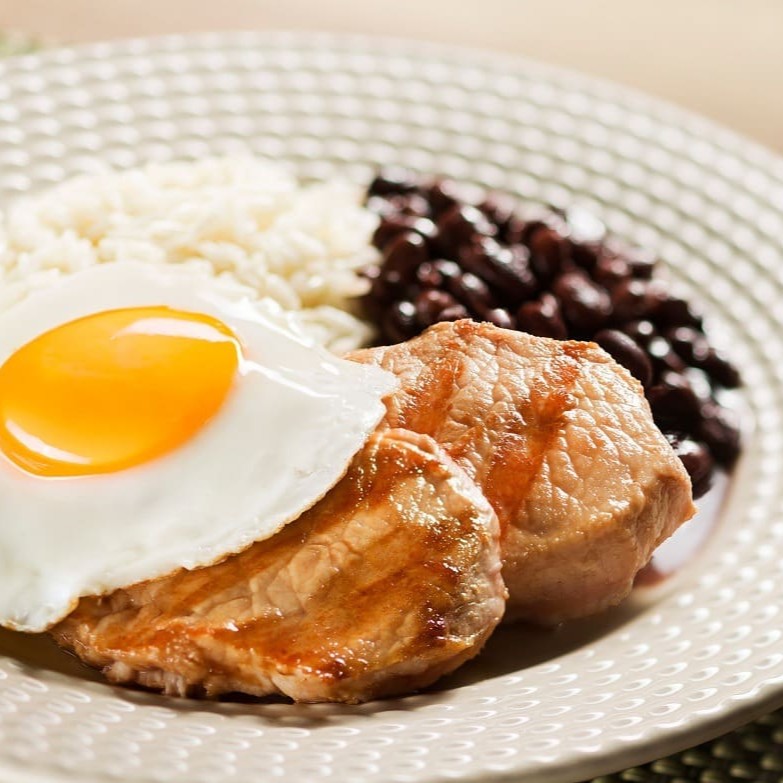 Arroz, Feijão, Massa, Farofa e acompanhamento do Dia. Uma saborosa Bisteca com ovo. Acompanha salada separada de cortesia.