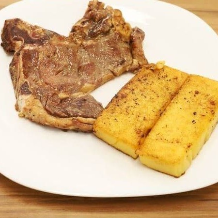 Uma deliciosa Chuleta com Polenta e arroz. Acompanha salada separada de cortesia.