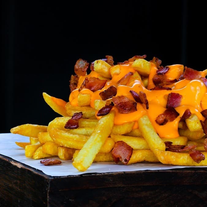 Uma saborosa porção de Fritas com Bacon e Cheddar.