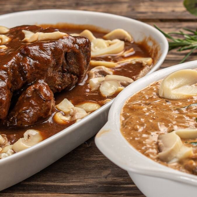 Mignon coberto com molho suave de mostarda e molho Demi Glacê. Acompanha arroz e batata palha.