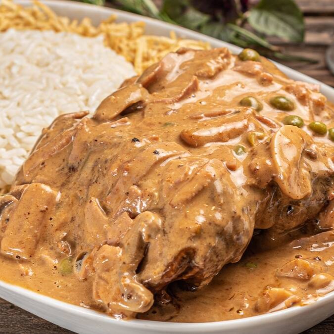 Mignon recheado com Catupiry e coberto com molho de aspargos. Acompanha arroz branco e batata palha.