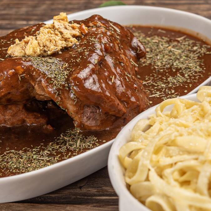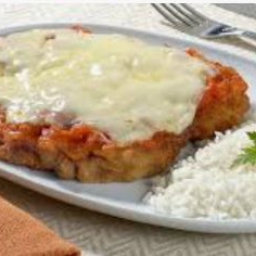 Filet mignon empanado e gratinado com queijo, presunto e molho ao sugo. Acompanha talharim na manteiga.