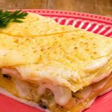 Lasanha recheada com fatias de presunto, queijo e molho quatro queijos.