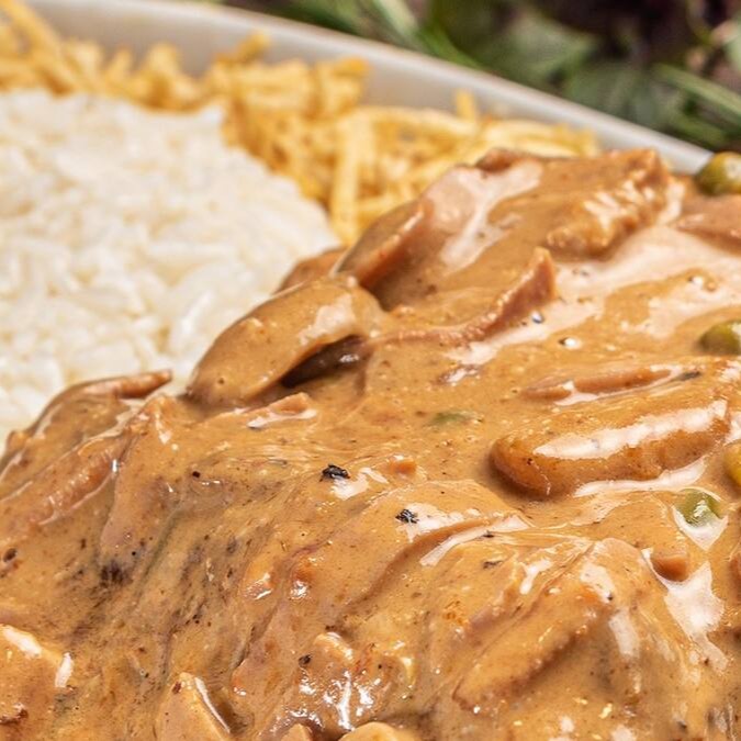 Escalopinhos de mignon ao molho suave de mostarda e Demi Glacê. Acompanha arroz branco e batata palha